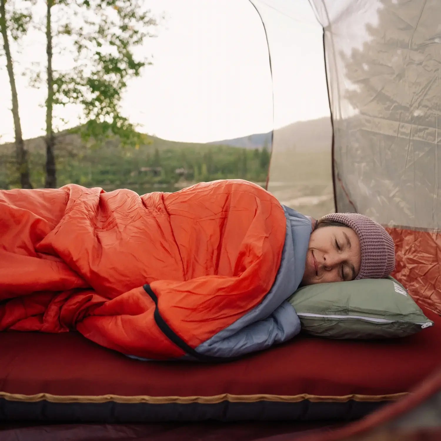 The outer fabric is strong enough to handle regular campsite use, while the soft inner lining feels smooth and comfortable against your skin. The two-way zipper for adjustable airflow and the built-in pillow pocket enhance convenience and overall comfort.