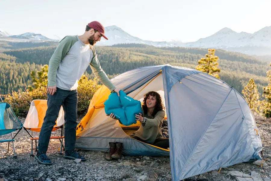 To inflate the Pillow X Large, open the valve and breathe 3–5 breaths into it. Close the valve once it reaches your desired firmness. It's quick and effortless, even in low-light conditions.